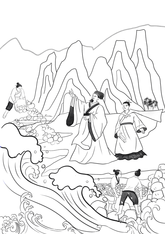 李冰帶上兒子李二郎,他們實地勘測山勢、水勢,風餐露宿走訪了許多地方,歷經(jīng)數(shù)月,終于抵達岷江源頭,又帶回大量珍貴的水文資料。之后,李冰廢寢忘食,總結(jié)前人治水的經(jīng)驗,提出“分洪以減災,引水以灌田”的治水方針,決定率領(lǐng)民眾在岷江上修建一座防洪、灌溉、航運兼用的大型綜合水利工程——都江堰水利工程,使川西平原從此成為“滿目稻麥,水旱從人,不知饑饉”的天府之國。